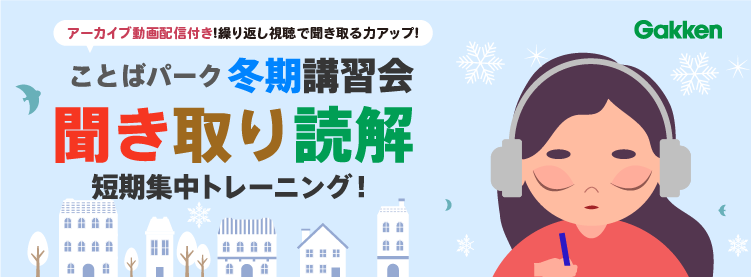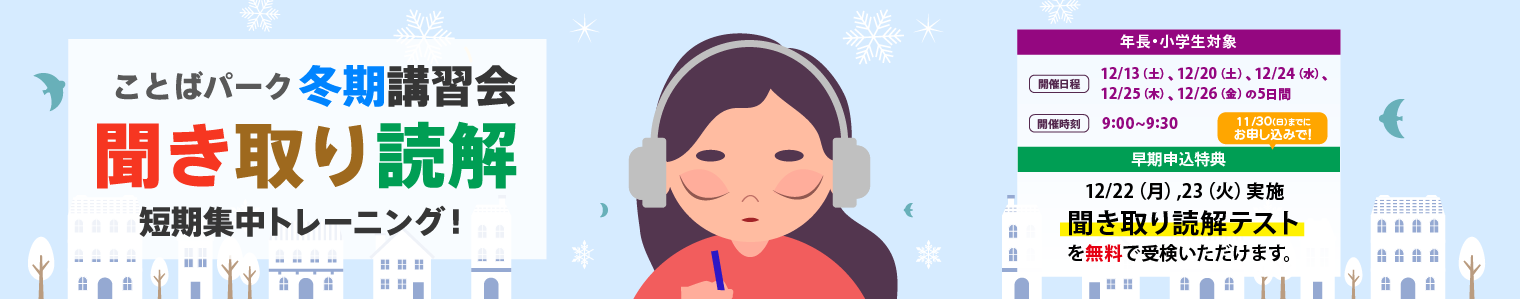 ことばパークのオンライン冬期講習会は、まず先生の話を集中して聞き、その内容を覚えておきながら、質問に答える《聞いて書く(ディクテーション)》形式で、【ぐっと集中する力】を高めるとともに読解力を向上させる工夫を凝らした集中トレーニングです。 集中する力を向上させて、冬休みの宿題に取り組んだり、新学年に向けて新しい体験にチャレンジしてみませんか?