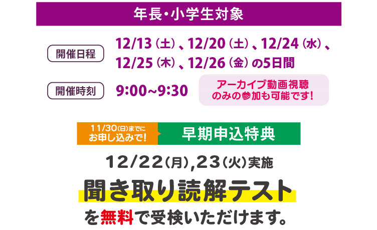 ※年長のお子さまはプレレベル(12/22 17:00~開催)、小学生以上のお子さまはレベル1(12/22 18:00~開催)を無料で受検いただけます