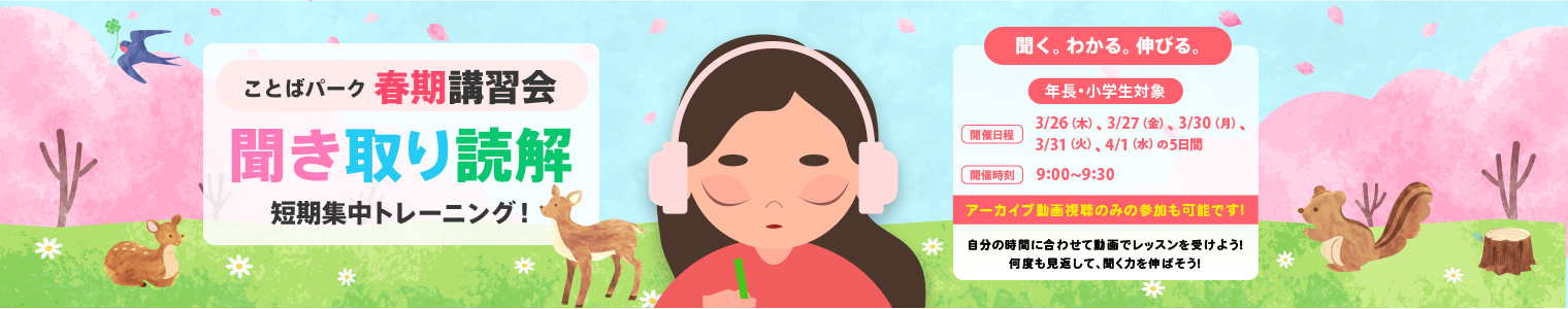ことばパークのオンライン春期講習会は、まず先生の話を集中して聞き、その内容を覚えておきながら、質問に答える《聞いて書く(ディクテーション)》形式で、【ぐっと集中する力】を高めるとともに読解力を向上させる工夫を凝らした集中トレーニングです。 集中する力を向上させて、春休みの宿題に取り組んだり、新学年に向けて新しい体験にチャレンジしてみませんか?